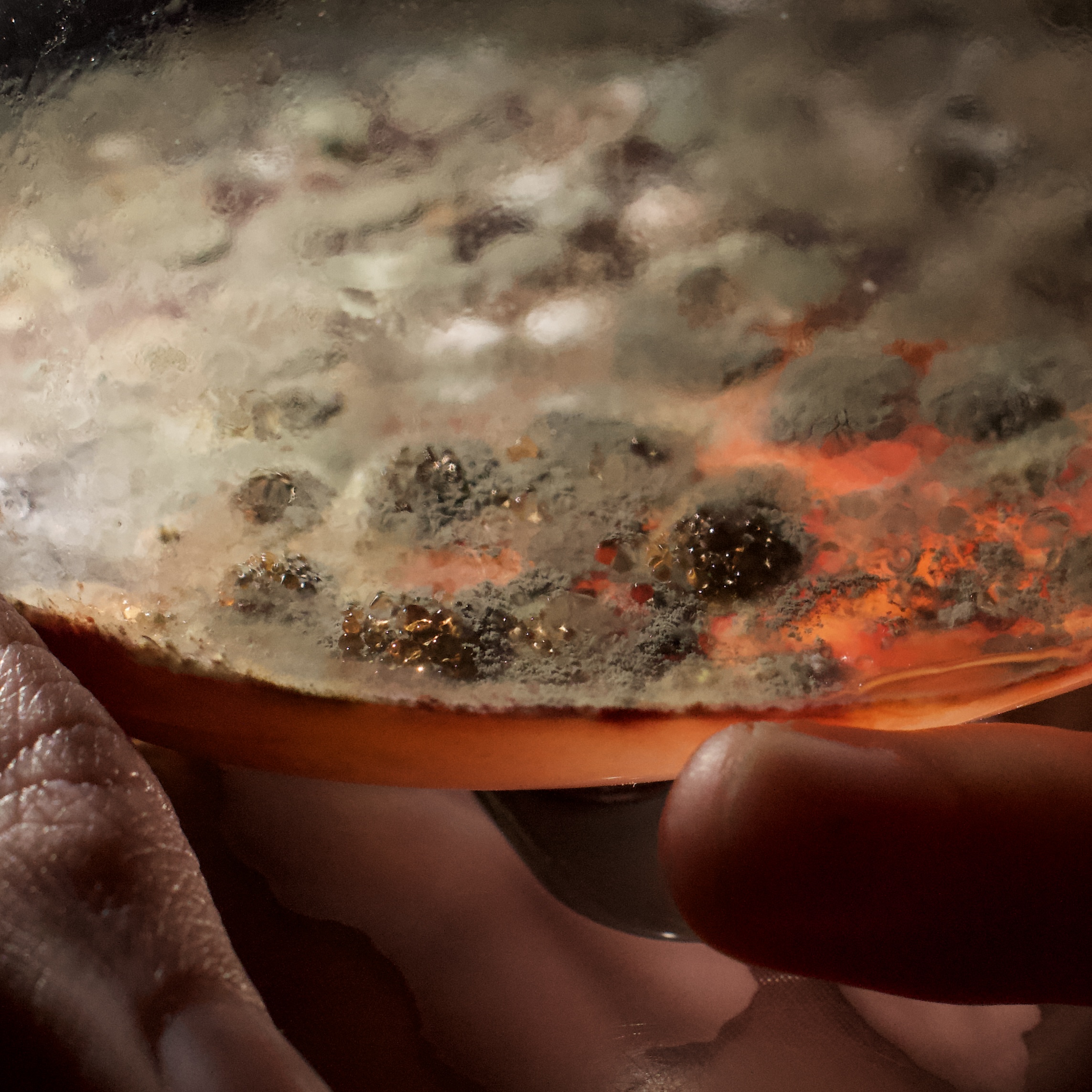 Upon the stacking of the agar ‘eggs’ I enclosed them in a pocket of air of the gallery air using the glass cloches. Previously undetectable by the human eye, the microbial life floating in the gallery air is rendered visible by the presence of the agar eggs. The colonies of mold sprawl across the uneaten agar, uniting them in a feast. As they claim territories, the egg stack depletes over time and becomes a blanket of varying textures and colors. By placing these communities of mold upon pedestals in a gallery setting (historically meant for objects of conventional beauty), I aimed to reframe them in a way that celebrates their intricate expressions; this gesture is in opposition to a human’s tendency to turn up their nose at the thought of mold.